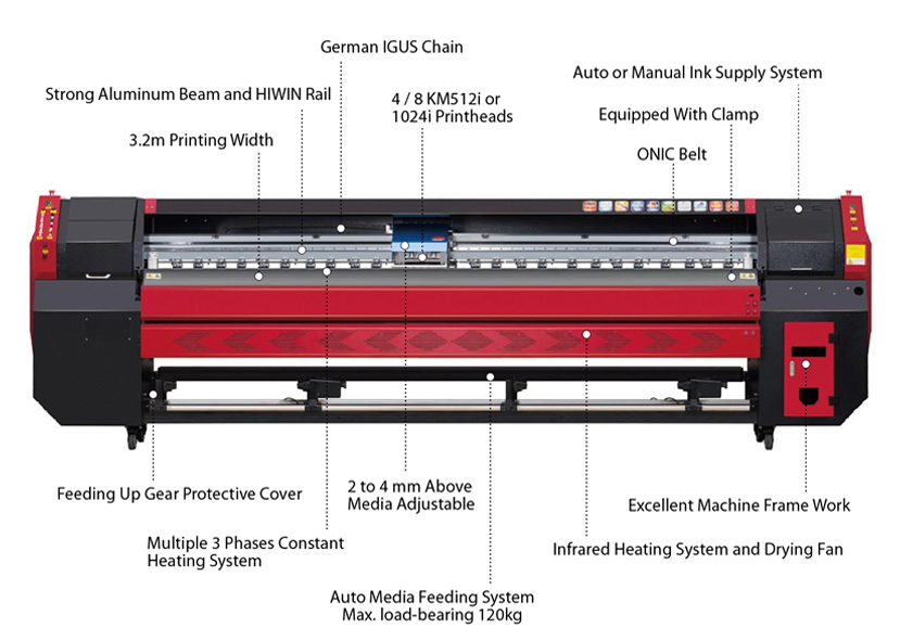 KJ-3208G adopt the newest Koncia Minolta 512i printhead, the maximum printing speed is 240 sqm/h. Efficient and productive KJ-3208G printer enable users increasing profit while save work time. .