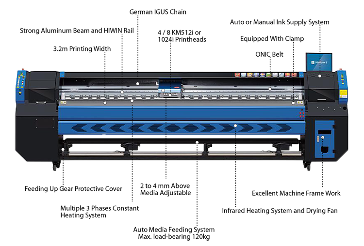 Equipped with Japan Konica 512i solvent print head, KINGJET KJ-3208G 3.2m printer can print at speeds of up to 240 sqm/h.